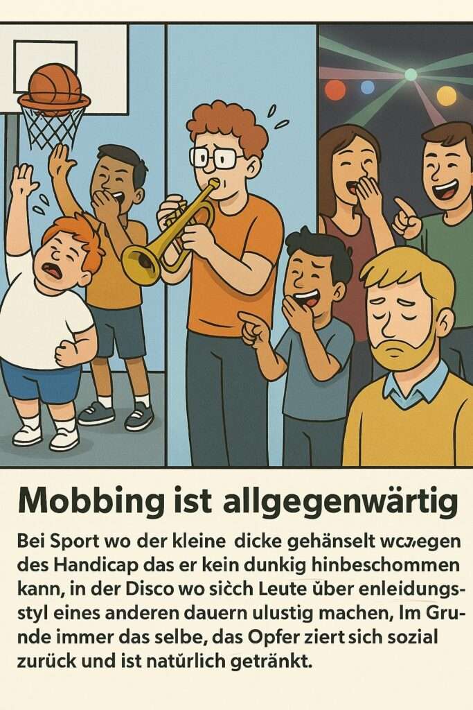 Mobbing ist ein weit verbreitetes gesellschaftliches Problem, das in vielen Lebensbereichen auftritt – sei es im Sport, in der Musikschule oder im Freizeitbereich. Oft beginnt es mit scheinbar harmlosen Kommentaren, doch die Wirkung auf die Betroffenen ist tiefgreifend. Im Sport wird etwa der kleinere, übergewichtige Junge verspottet, weil er keinen Dunking schafft – nicht etwa wegen mangelndem Ehrgeiz, sondern aufgrund körperlicher Voraussetzungen. In der Musikschule kämpft ein kräftiger Schüler mit Asthma, was ihm das Spielen der Trompete erschwert. Statt Unterstützung erfährt er Spott. In der Disco wird jemand wegen seines Kleidungsstils lächerlich gemacht, obwohl Mode Ausdruck individueller Persönlichkeit ist.