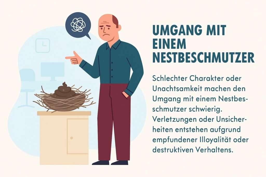 Der Umgang mit einem sogenannten „Nestbeschmutzer“ kann emotional und sozial herausfordernd sein, besonders wenn die Person Kritik an der eigenen Gemeinschaft, Familie oder Organisation äußert. Schwierigkeit entsteht oft durch die Wahrnehmung, dass solche Kritik illoyal oder destruktiv sei – selbst wenn sie berechtigt ist. Wenn der Nestbeschmutzer einen schweren Charakter hat, etwa durch Sturheit, Misstrauen oder mangelnde Empathie, wird der Dialog zusätzlich erschwert. Solche Persönlichkeiten neigen dazu, sich unverstanden zu fühlen und reagieren oft mit Trotz oder Rückzug.