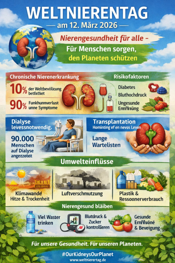 Der Weltnierentag findet jedes Jahr im März statt. Im Jahr 2026 fällt er auf den 12. März. Weltweit steht der Aktionstag unter dem Motto „Nierengesundheit für alle – für Menschen sorgen, den Planeten schützen“.